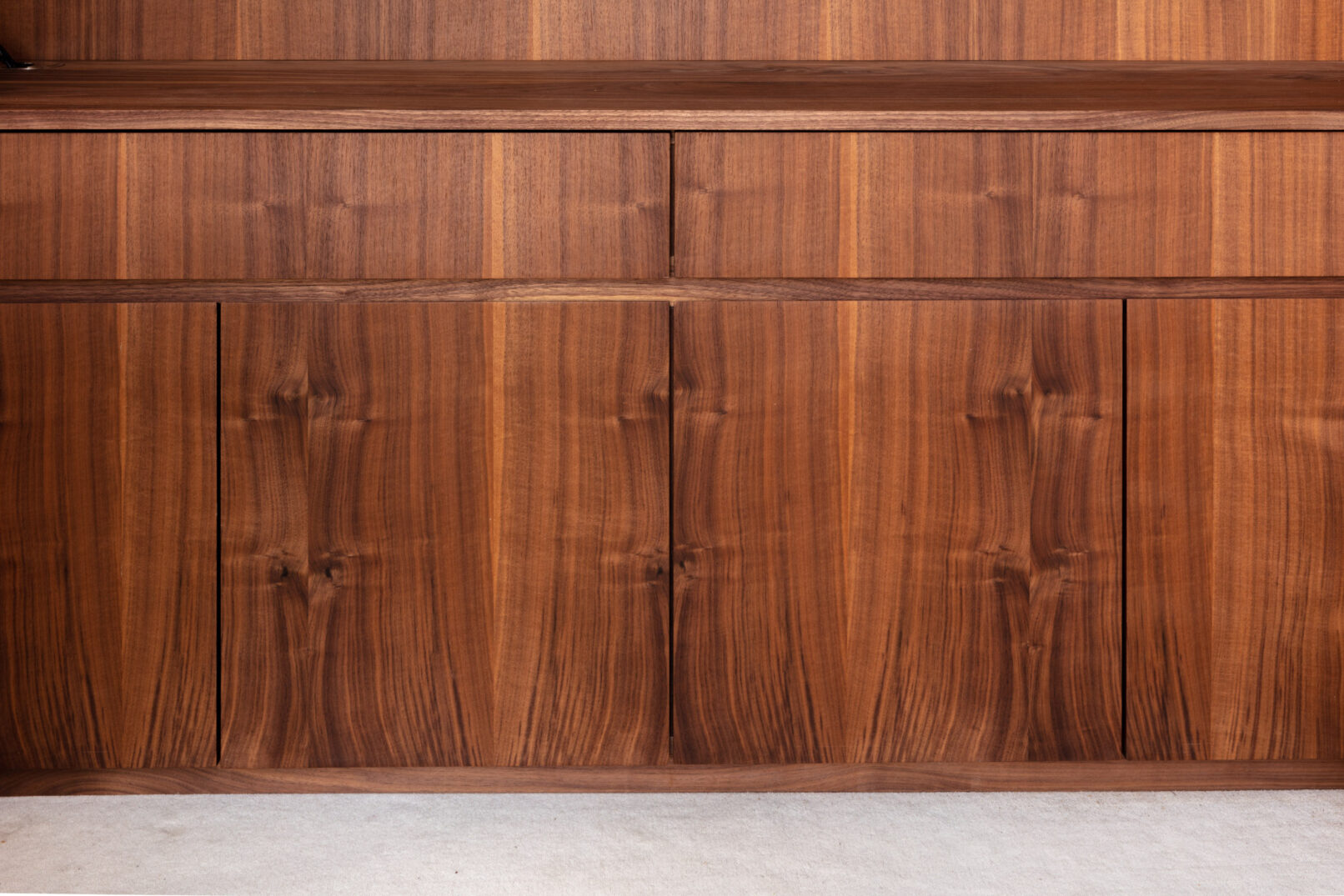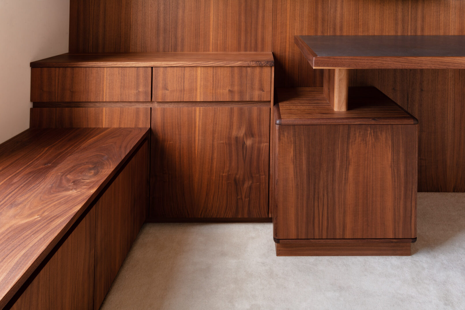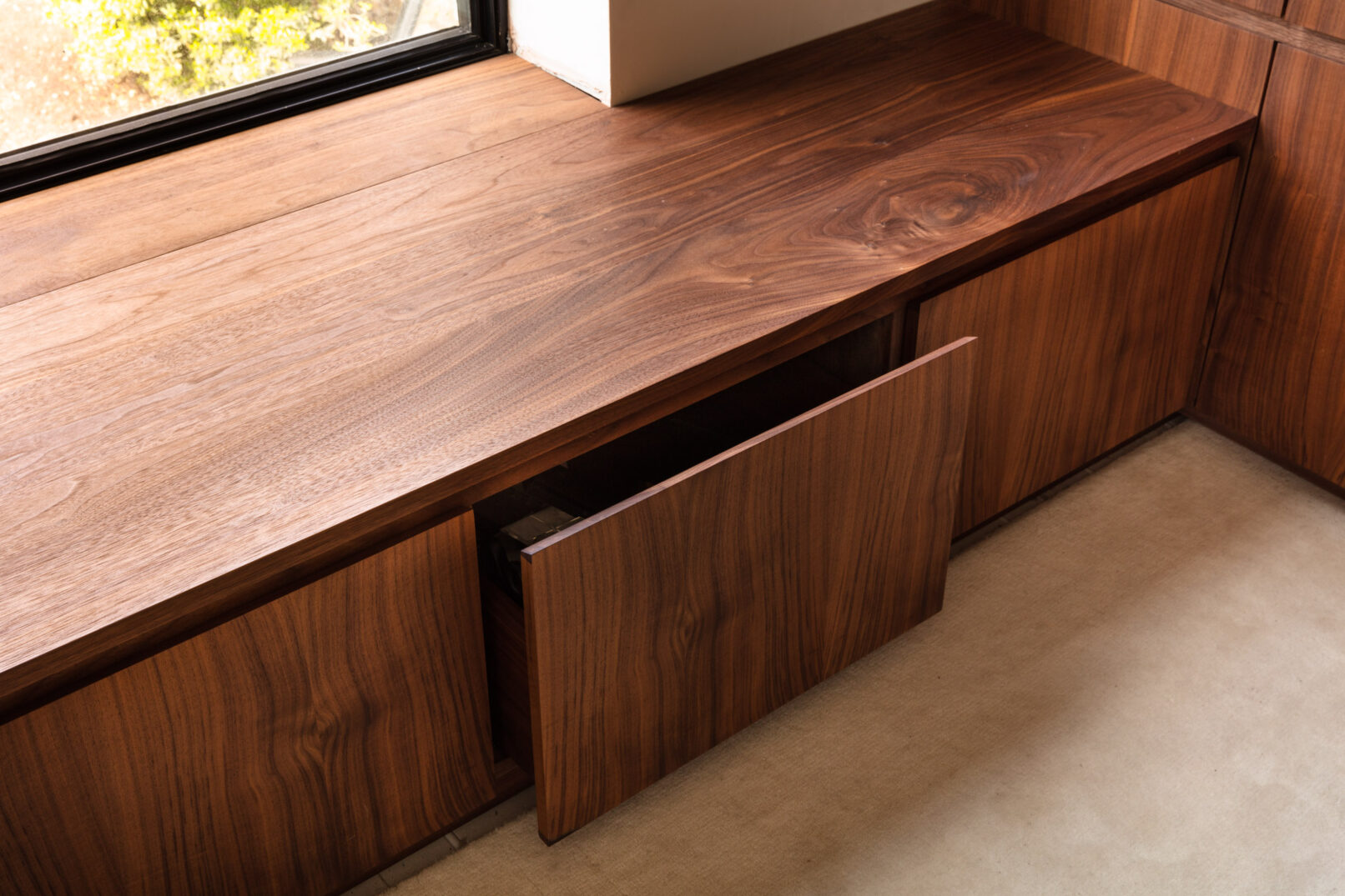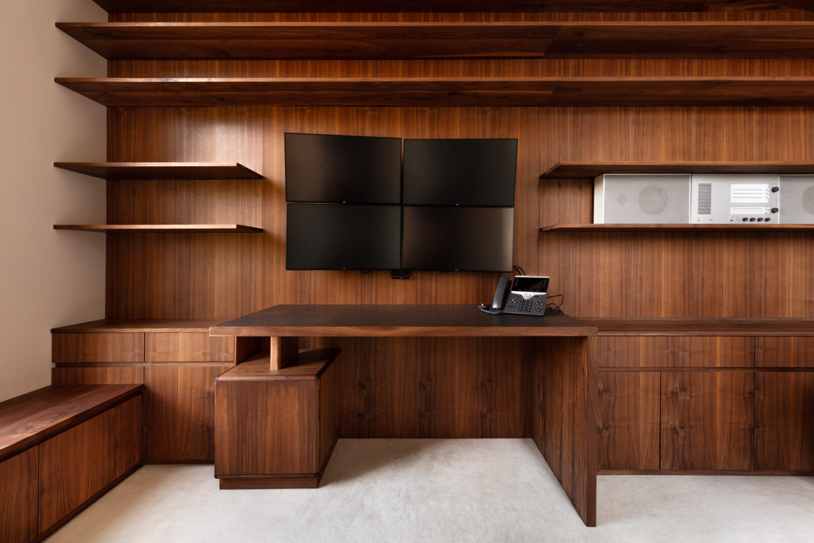 A whole walnut wood work for this home in London. The residence’s owners wanted his studio to be extremely functional and feel warm and cosy at the same time. We designed a walnut wood joinery to cover the extension of the home and provide enough space for working, storage and relaxing at the window.