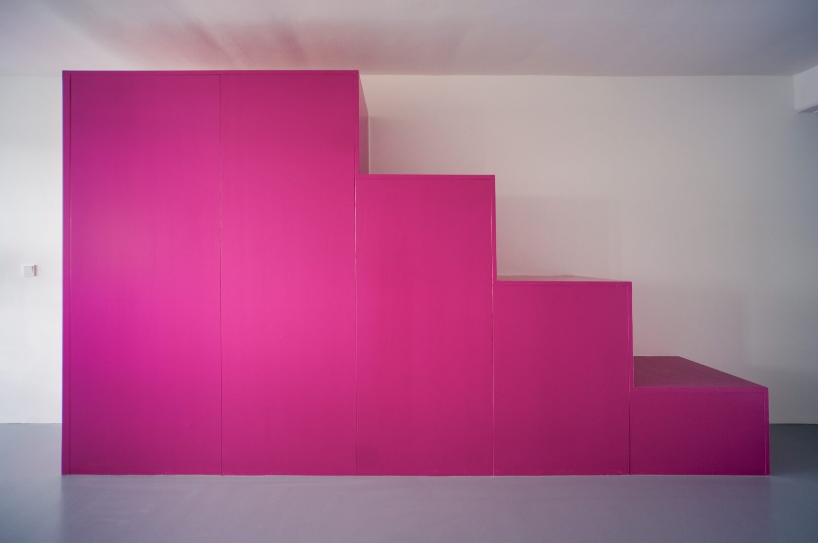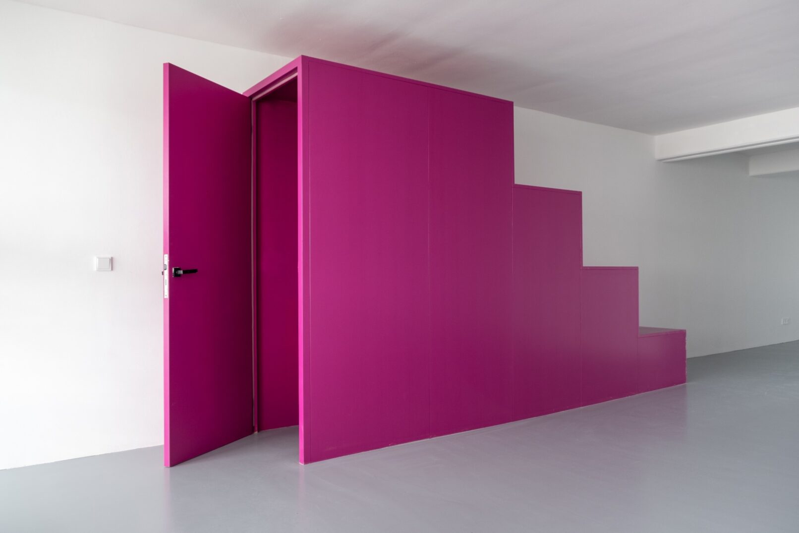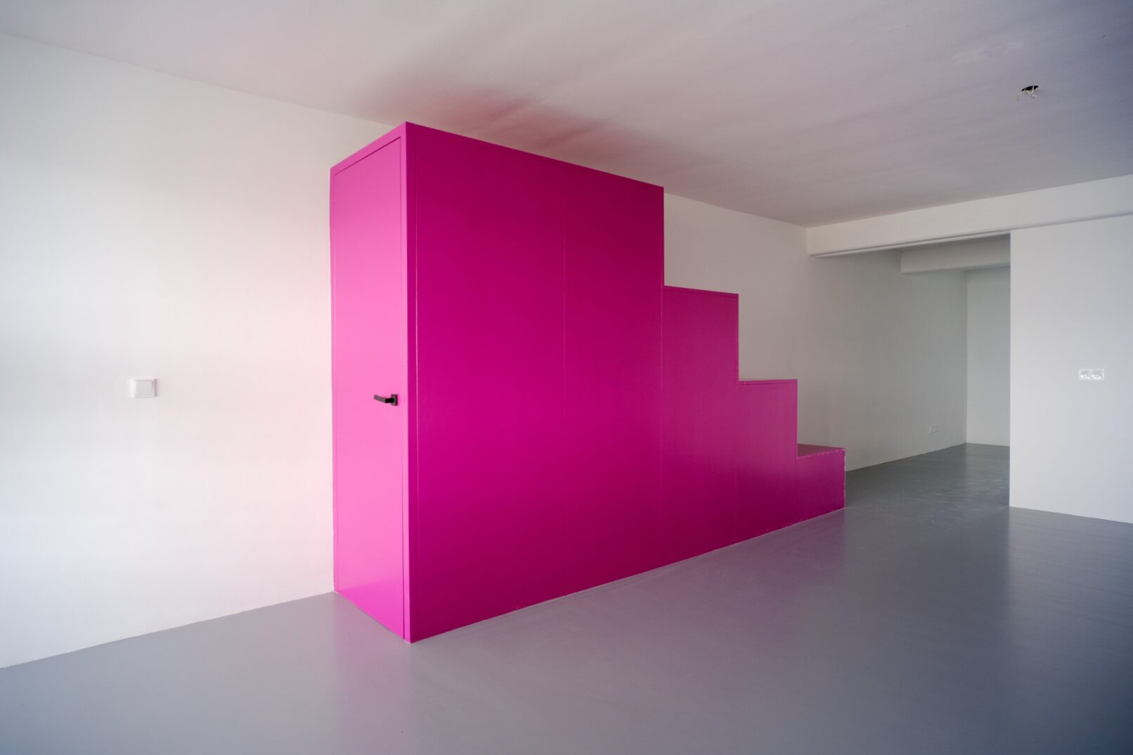 In dialogue with the owners, we designed a module that serves as a staircase and seating space, attached to the slab between the two floors, like a colourful tunnel between the first and second floors.