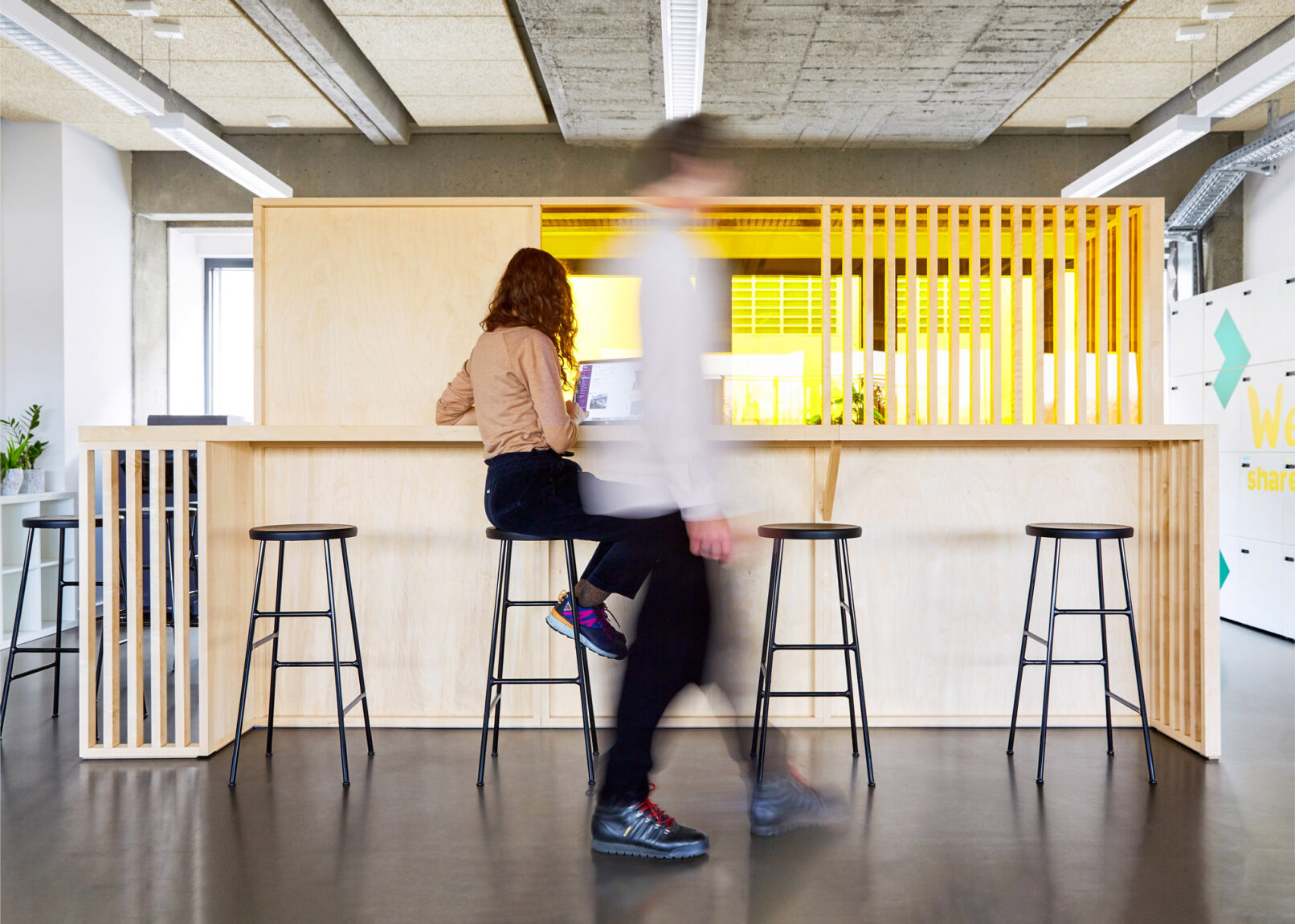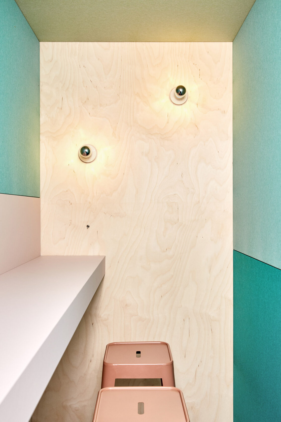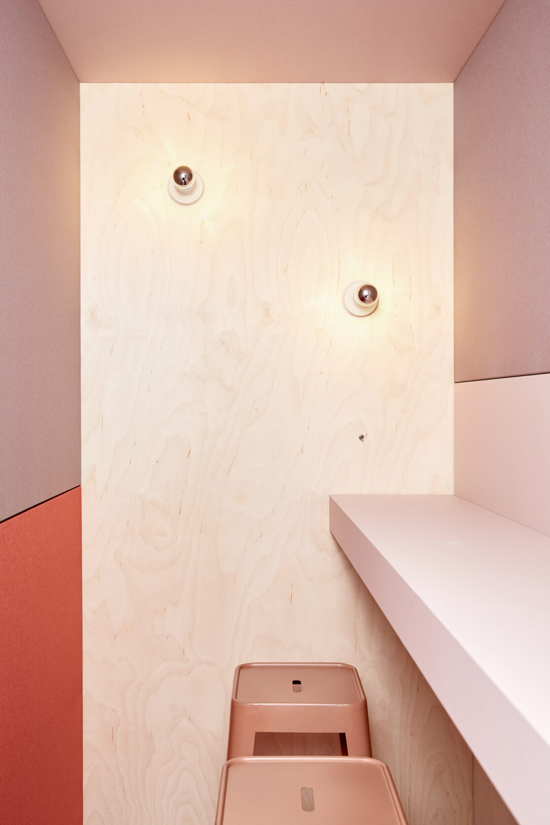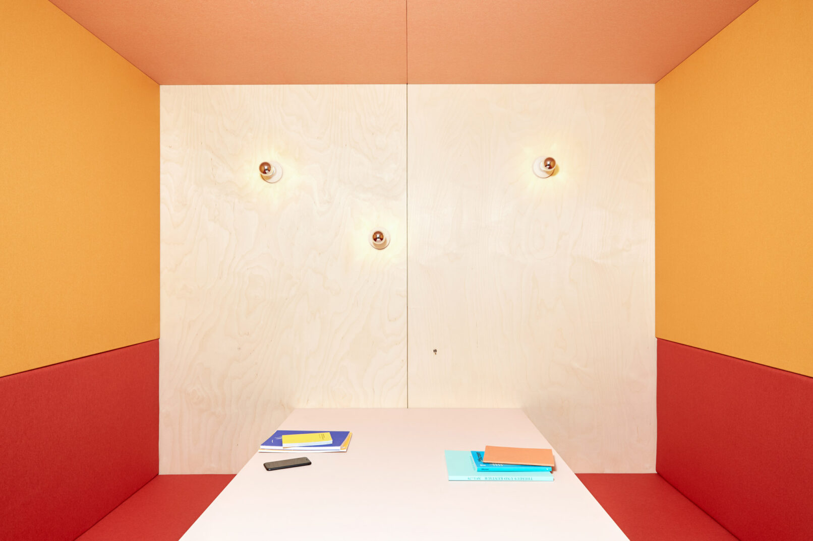 The custom-made, birch plywood phone booths stand as landmarks on the grey vinyl flooring creating a contrast between the minimal bright exterior and the colourful warm interiors. The booths host private phone-calls and small meetings. Two-size modules phone-booths function also as screens for the annex relaxation area, equipped with a wide and comfortable sofa that overlooks the windows.