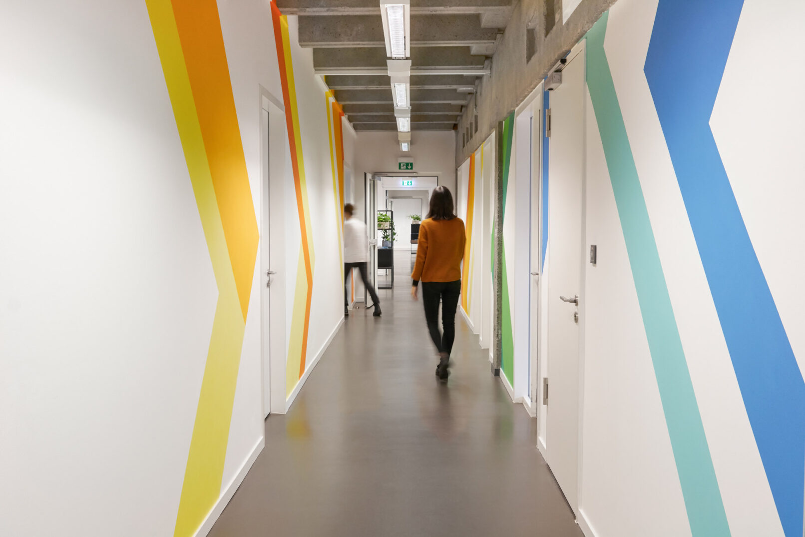 In collaboration with architect Giulia Fagni and set designer Simone Serlenga, I decided to make the office environment more welcoming by using energizing color palettes and a rich material scheme. The interiors boast bold color combinations, plants, shielded relax areas and different textiles. Graphic murals and tactile seats keep the employees focused and comfortable.